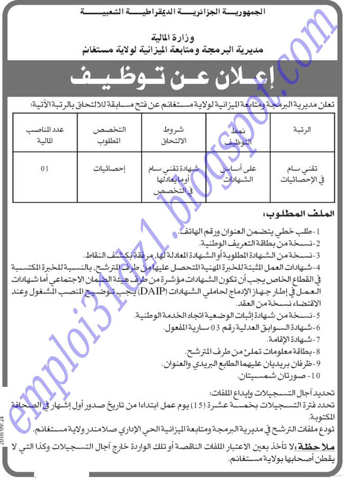 إعلان توظيف بمديرية البرمجة ومتابعة الميزانية لولاية مستغانم سبتمبر 2016 المنــاصب المفتوحة: * تقني سامي في الإحصائيات: منصب واحد (01) إعلان توظيف بمديرية البرمجة ومتابعة الميزانية لولاية مستغانم سبتمبر 2016